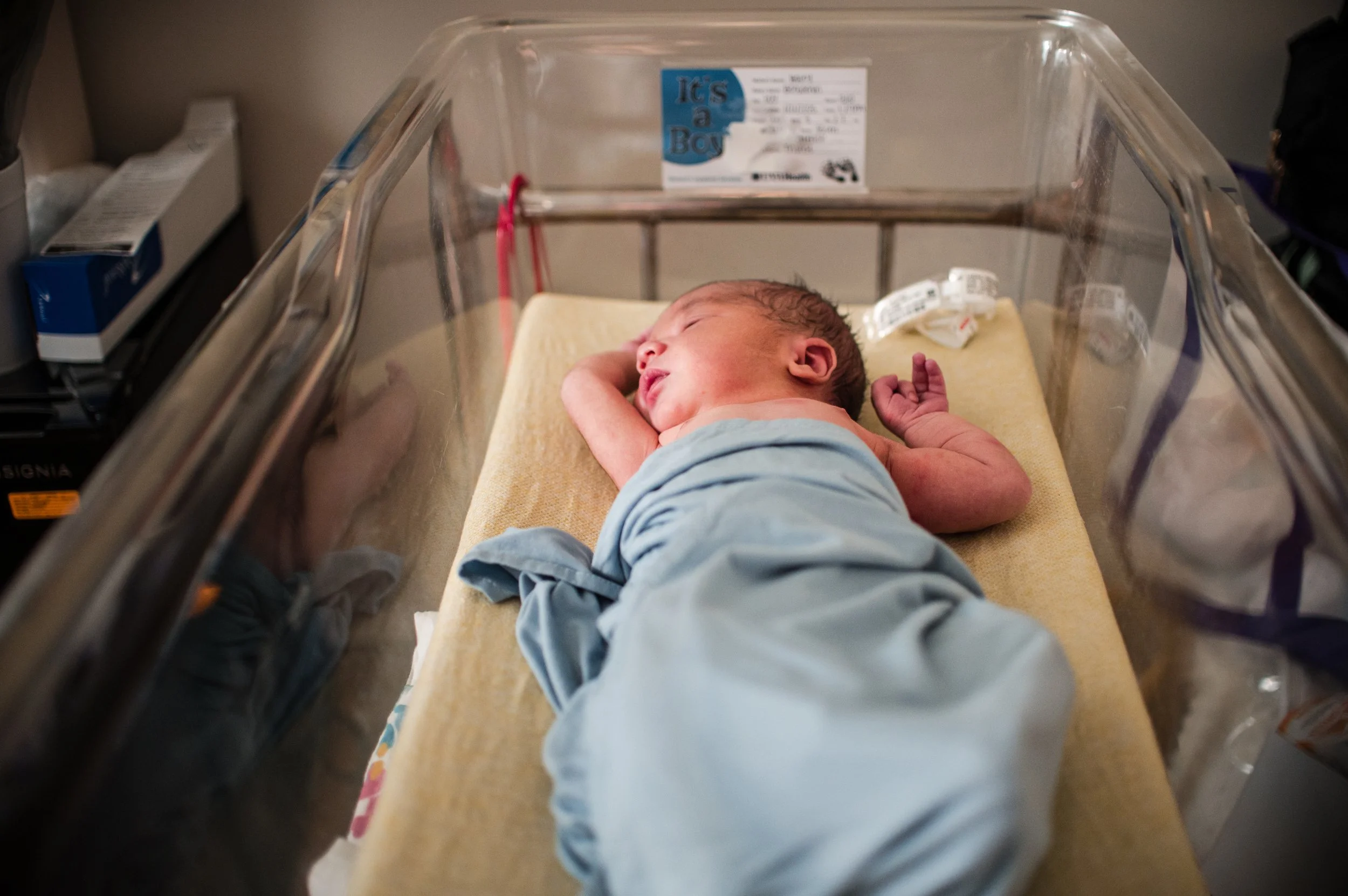 Newborn baby in a bassinet in a hospital room.